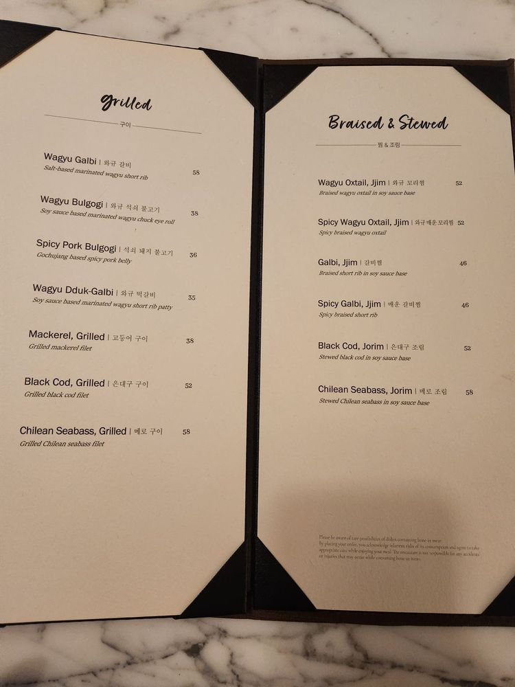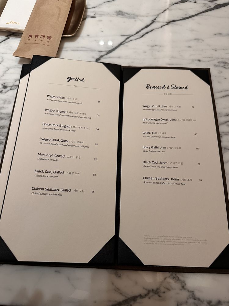 Salt base marinated wagyu short rib. Served with a set of banchan (side dishes), a bowl of soy bean spinach soup, lettuce, soybean paste, and rice.
